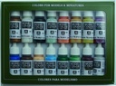 Set with 16 Model Color for painting models and miniatures. This set has a specific selection of colors for painting medieval vehicles, figures, etc. Contains 16 bottles of 17 ml./0.57 fl.oz. and color chart.