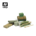 Seven metal cases of different sizes and designs, used for the transport and storage of military equipment.