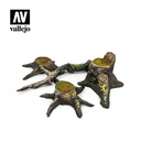 Three dry trunks, two fallen and one standing on roots, with detailed bark texture and interior. Ideal to place on dioramas, choosing the tones to depict wet or dry environments, even adding tufts or moss from Vallejo Scenery references.